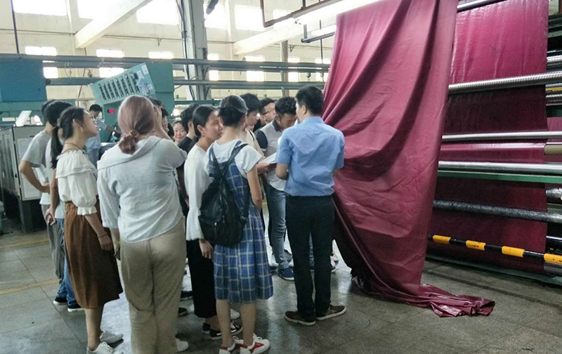 第二站,學生參觀涂層廠。涂層廠技術科主管莊培釗向學生介紹布料涂層處理技術,展示制作成品,并由技術工人向學生示范操作壓光機。